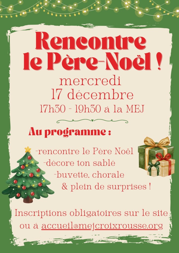 Mercredi 17 décembre, venez profiter de la fête de fin d’année à la MEJ ! Au programme, une rencontre avec le Père Noël (et une photo de famille bien sûr !), un atelier pour décorer son sablé, notre buvette traditionnelle (chocolat & vin chauds, gaufres & crèpes, pour financer les projets du secteur jeunesse), une chorale et encore plein d’autres surprises !