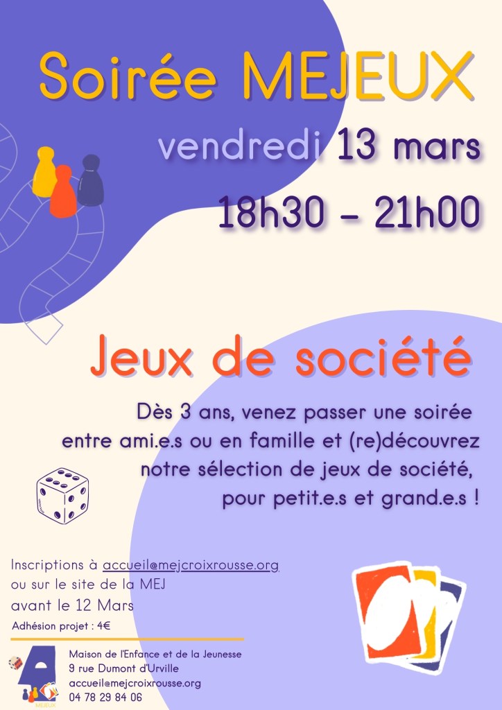Vous avez entre 3 et 99 ans ? Vous êtes initié ou accro aux jeux de société ? Les soirées MEJEUX sont faites pour vous. Des animateur.rice.s de la MEJ préparent pour vous une soirée à thème autour du jeu de société. Jeux musicaux, jeux de rôles, jeux de cartes, … Il y en a pour tous les goûts, alors n’hésitez plus et venez en famille ou entre ami.e.s !