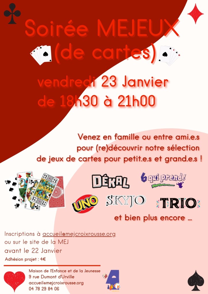 Vous avez entre 3 et 99 ans ? Vous êtes initié ou accro aux jeux de société ? Les soirées MEJEUX sont faites pour vous. Des animateur.rice.s de la MEJ préparent pour vous une soirée à thème autour du jeu de société. Jeux musicaux, jeux de rôles, jeux de cartes, … Il y en a pour tous les goûts, alors n’hésitez plus et venez en famille ou entre ami.e.s !