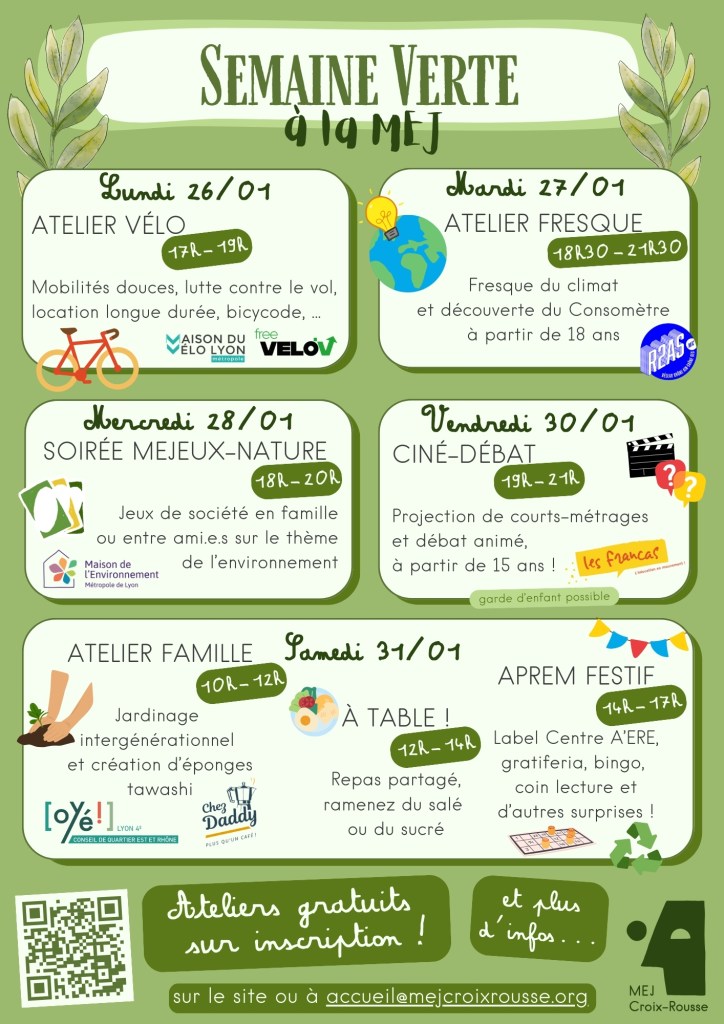 La MEJ vous propose une Semaine Verte du 26 au 31 janvier 2026, pour valoriser les actions éco-citoyennes de l’association et de ses adhérent.e.s.